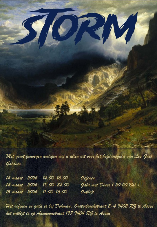Welkom op het gala van Les Gais Galants, 14 & 15 maart 2026 Les Gais Galants viert dit jaar haar 61e verjaardag. Het thema is Storm! Opnieuw vinden alle activiteiten plaats bij Danscentrum Dokman, Assen.
